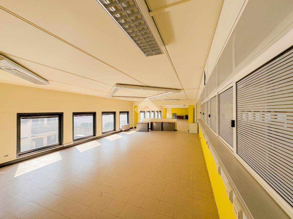 Proponiamo in locazione un ufficio di circa 180 metri quadrati disposti al piano primo di una struttura condominiale di quattro livelli.