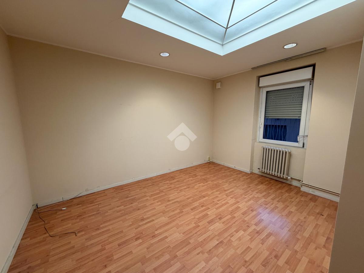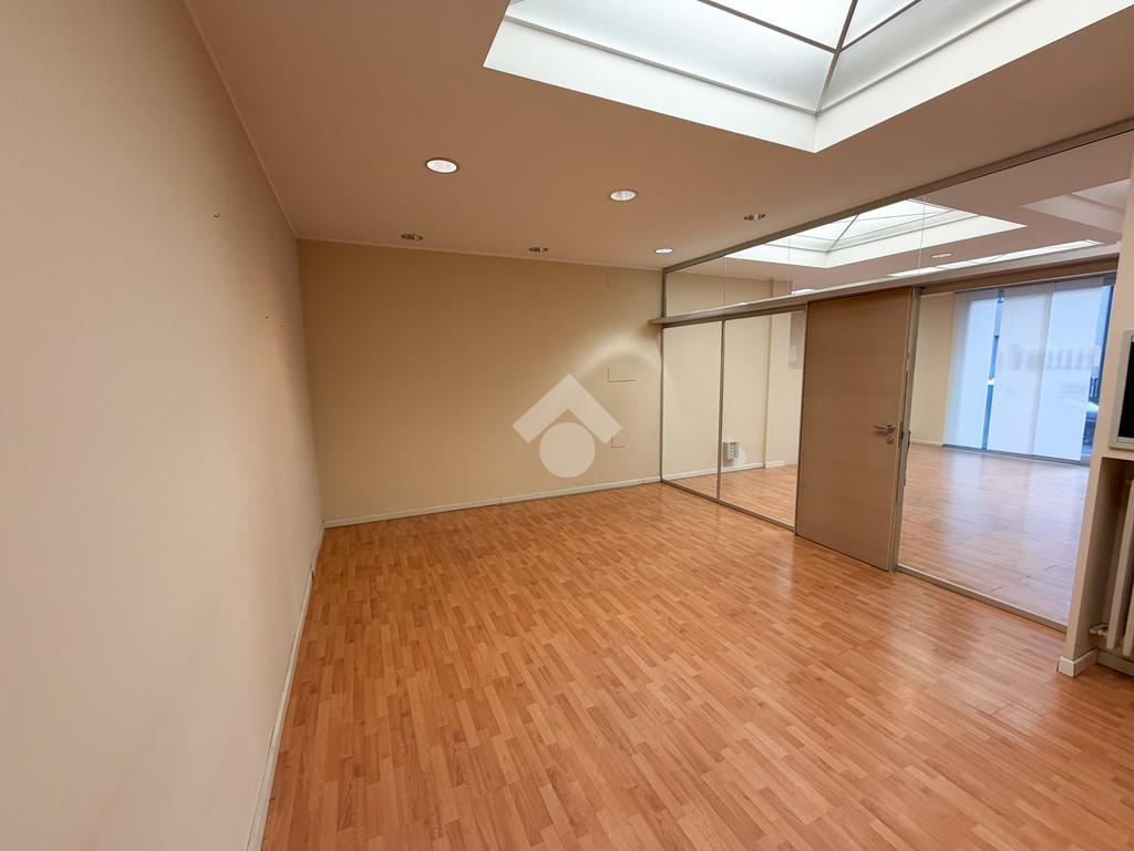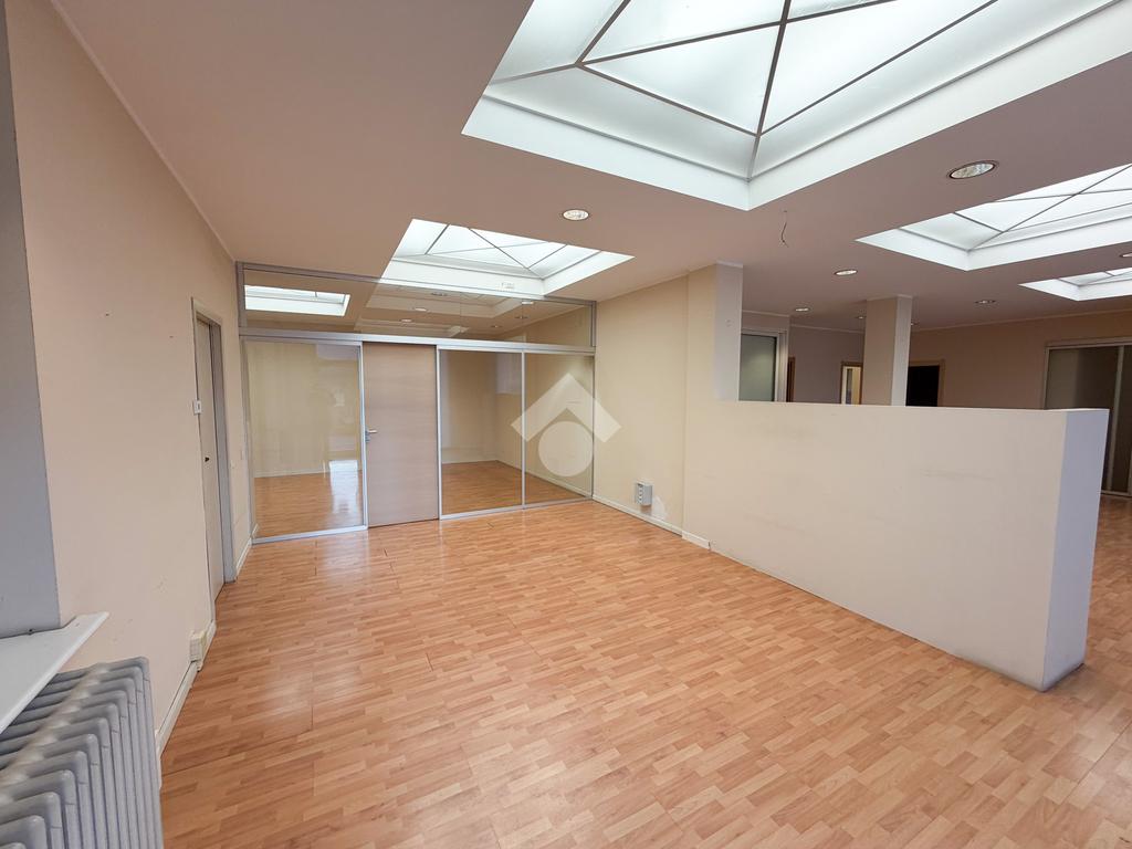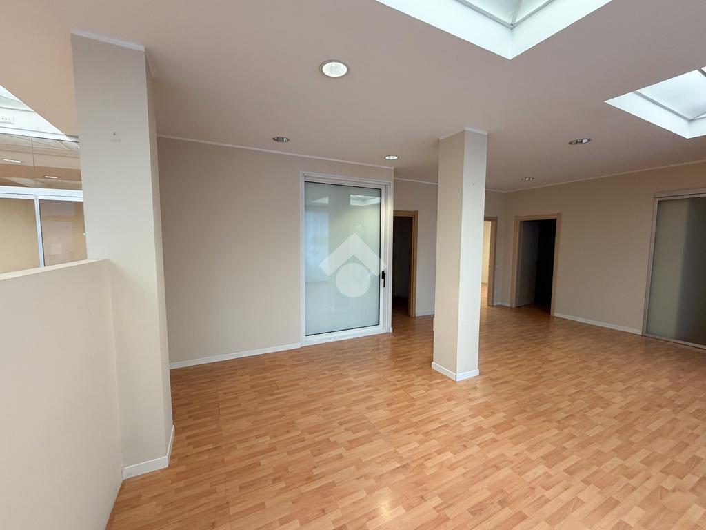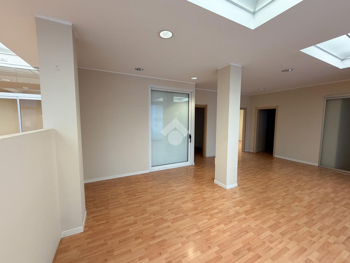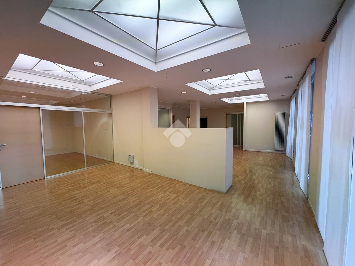 L'ufficio misura 160 metri quadrati e si suddivide in cinque locali. La soluzione è dotata di due servizi igienici privati ed è caratterizzata da una pavimentazione in parquet. L'ambiente risulta particolarmente luminoso grazie a quattro grandi vetrine. Il locale possiede l'impianto di riscaldamento, l'impianto elettrico e quello di illuminazione. L'immobile, completamente controsoffittato, è servito dall'impianto di allarme. Inoltre, è cablato e possiede connessione ad Internet a banda larga.