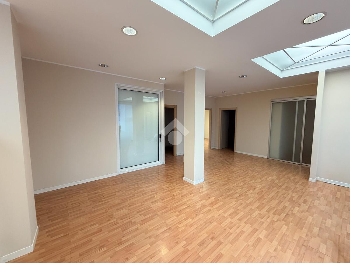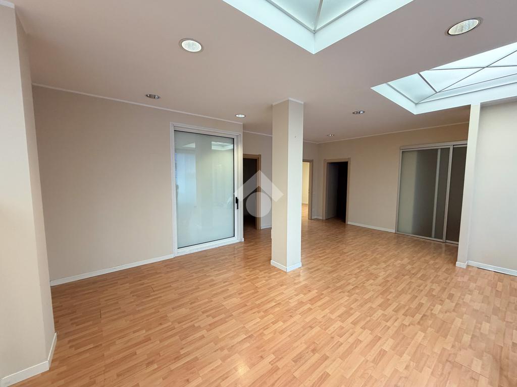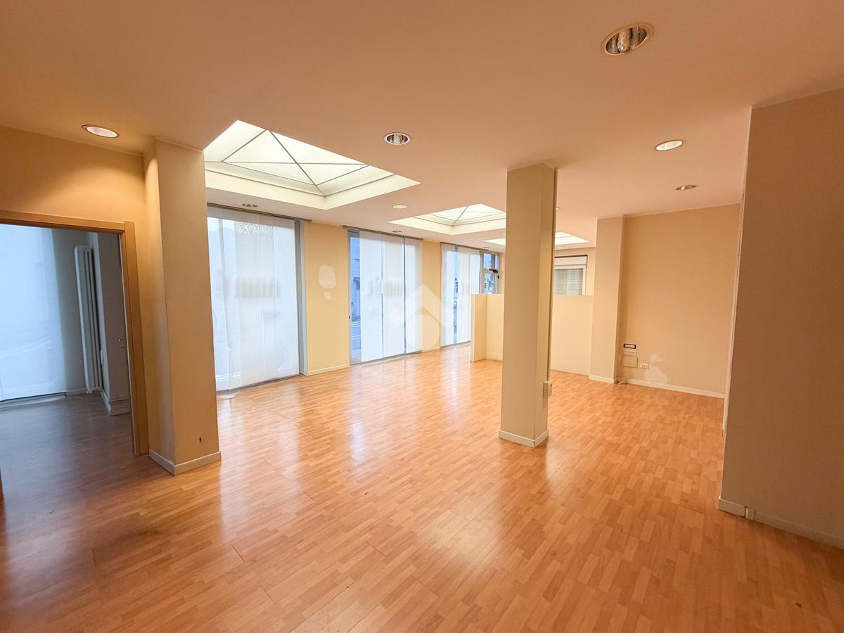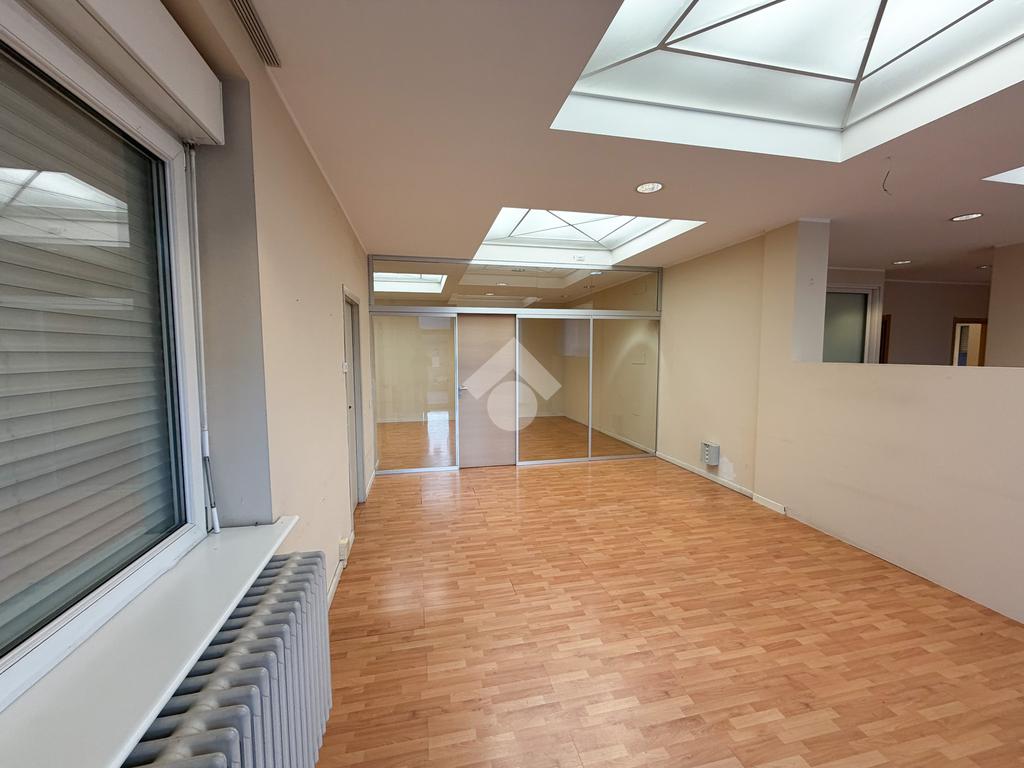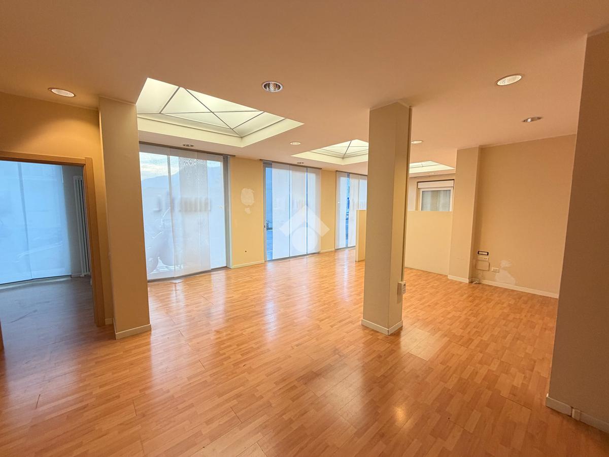 L'ufficio misura 160 metri quadrati e si suddivide in cinque locali. La soluzione è dotata di due servizi igienici privati ed è caratterizzata da una pavimentazione in parquet. L'ambiente risulta particolarmente luminoso grazie a quattro grandi vetrine. Il locale possiede l'impianto di riscaldamento, l'impianto elettrico e quello di illuminazione. L'immobile, completamente controsoffittato, è servito dall'impianto di allarme. Inoltre, è cablato e possiede connessione ad Internet a banda larga.